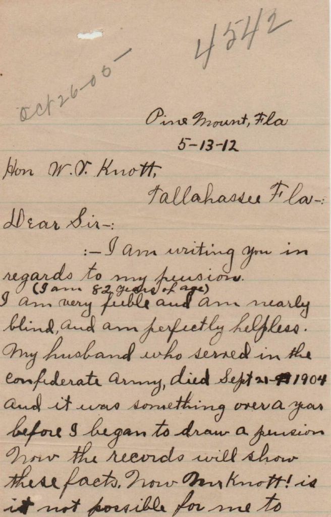 I am writing to you in regards to my pension. (I am 82 years old.) I am very feeble and am nearly blind and am perfectly helpless. My husband who was in the Confederate Army died September 21 1904 and it was something over a year before I began to draw a pension.