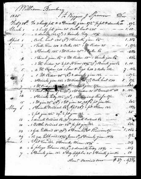 William, it seems, was quite the tippler, putting away many “Drinks” of gin, cider, cordial, and the occasional “tody” (rum drink). Sometimes he skipped the glass and just bought a pint or a gallon to take home with him!