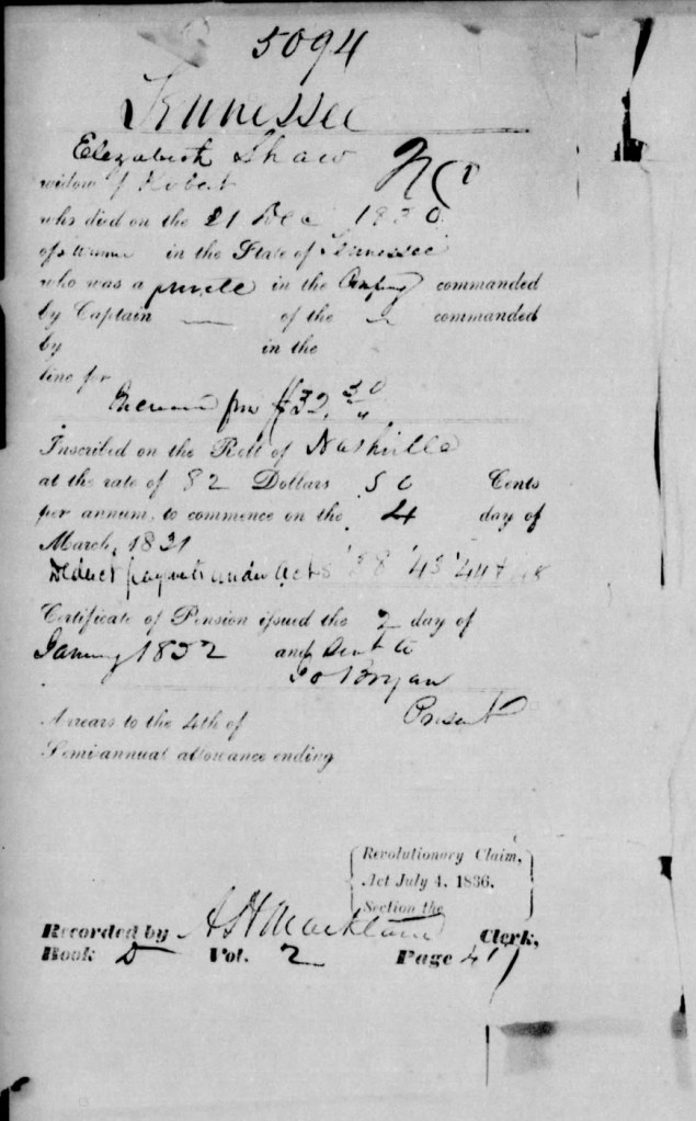 On this 4 day of July 1840 personally appeared before me one of the acting Justices of the Peac in and for said County Elizabeth Shaw a resident of said County Aged Eighty-five years who being first Duley Sworen acording to Law Doth on her oath make the folowing Declaration in order the obtain the benefit of the provision maid by the act of Congress past July the 4 1836 that she is the widow of Robert Shaw who was a Soldier in the North carolina Line in the war of the revolution and served as folows