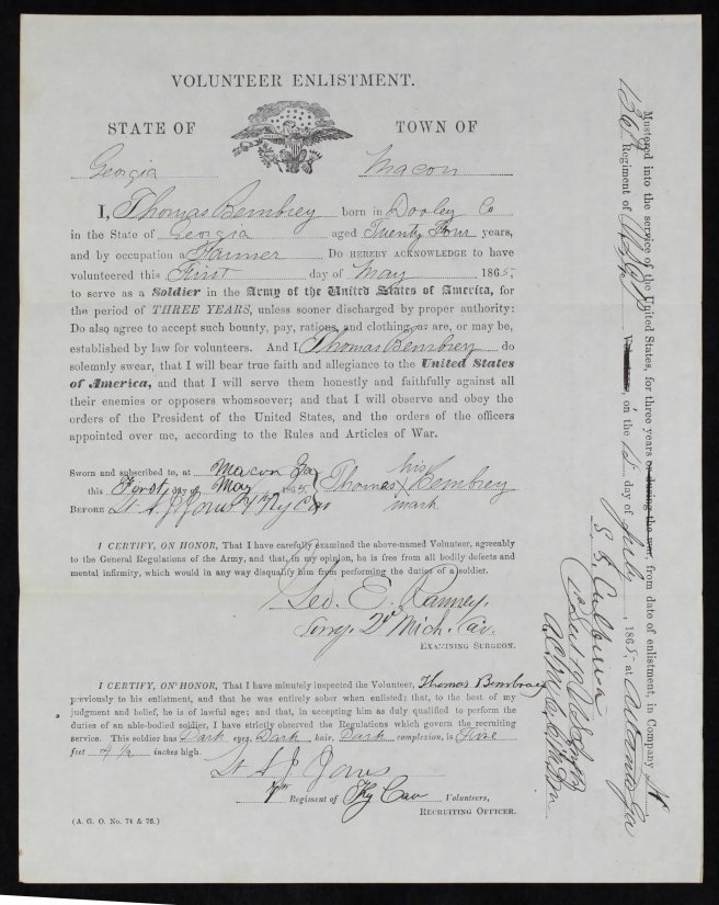 Thomas Bembry would have been emancipated by Union troops by the spring of 1865. Shortly after the surrender at Appomattox, he traveled to nearby Macon to enlist with the U.S. Army.