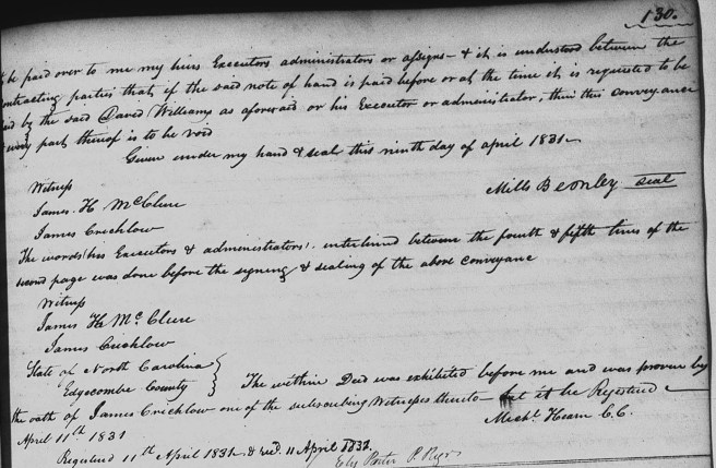 No doubt as a result of this suit, in November of 1829 Kenneth returned to Edgecombe County and presented himself in court to relinquish guardianship. He was replaced by Eli Howell, another local man of property. The results of an audit of Kenneth’s guardianship were presented in court in February of 1830. The deed below shows that Kenneth was determined to be in debt to the estate to the tune of $2,300, due 1 January 1830. He promptly skedaddled back to Florida, of course, where he was counted on the 1830 census and bought $500 worth of real estate in November of that year.