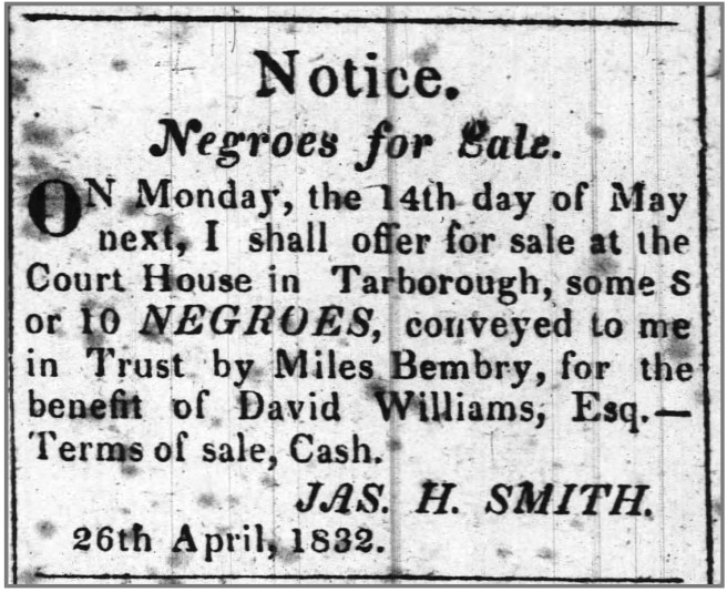 The debt was not paid, and the enslaved people were advertised for sale in April of 1832, auction to take place on 14 May 1832 in Tarborough. Note that sales did not always actually take place as advertised, however, it seems likely, given the back story, that this one did. One can only hope that the women were sold together with their children, but I have no further record of them.