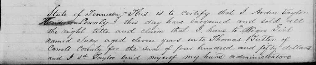 One of my questions regarding these Thomases was to determine whether or not my Thomas was a slaveholder. There are several Carroll County deeds, court records and slave schedules mentioning a Thomas Butler, but which one? After carefully picking through them, I believe that Thomas did indeed hold two slaves. In 1841, he purchased “a negro girl, Lucy, aged about eleven years” for $450 from Arden Taylor. (Carroll County Deed Book E, pp 187-188 at Family Search.)
