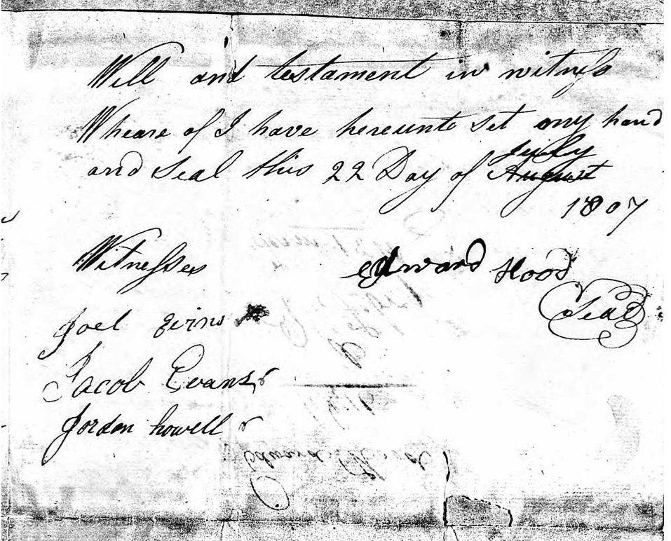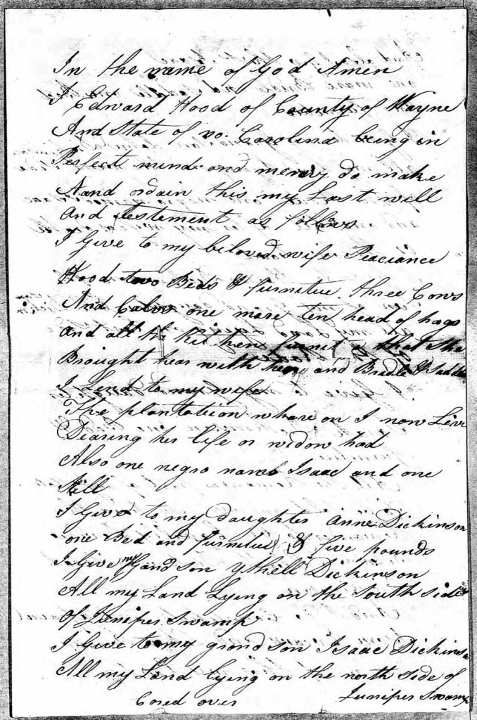In the name of God Amen. I Edward Hood of County of Wayne And State of no. Carolina being in Perfect mind and memory do make And ordain this my Last will and Testament as follows:
