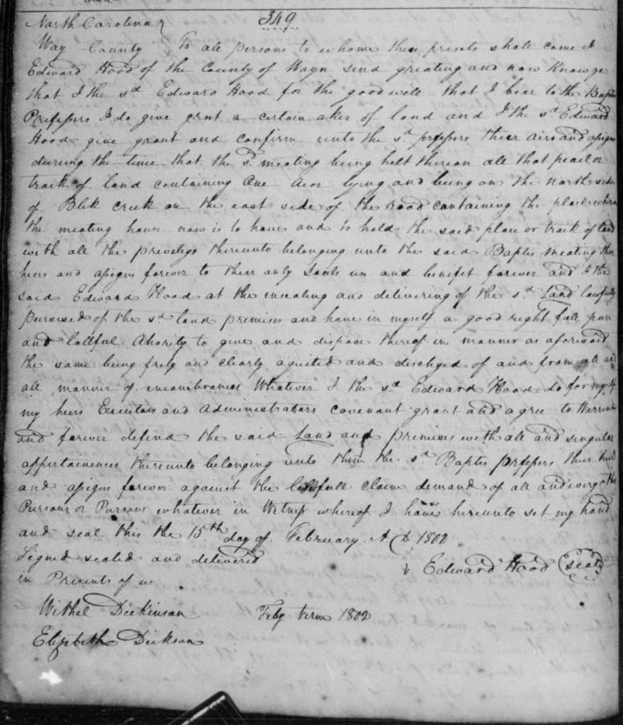 One of Edward Hood’s deeds is interesting. On 15 April 1802, he gave an acre of land on Black Creek to the “Baptist professors” so they could build a meeting house. By this, he did not mean academic professors, he meant those who profess the Baptist faith. Presumably, this meant that Edward himself was a Baptist. (The tract described as being “on the east side of the road” could well be the site of the current Lower Black Creek Church, located along Black Creek and US 117 in Wilson County, NC.)