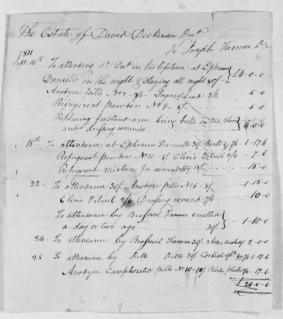 David Dickinson died, without a will, in September of 1811. The first item in his estate file is a detailed bill from his doctors. It shows that David died as a result of some kind of accident (perhaps a fall from a horse?) and that the treatment itself was pretty harrowing. A rough transcription follows.