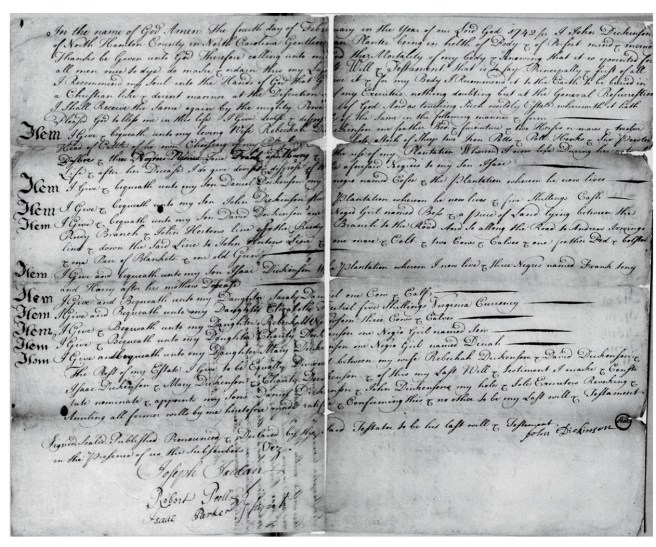 In the name of God Amen. The fourth day of February in the year of our Lord God 1742. I John Dickinson of North Hampton County in North Carolina Gentleman Planter being in health of Body & of Perfect mind & memory Thanks be Given unto God Therefore calling unto mind the Mortality of my body & knowing that it is apointed for all men once to dye do make & ordain this my Last Will & Testament