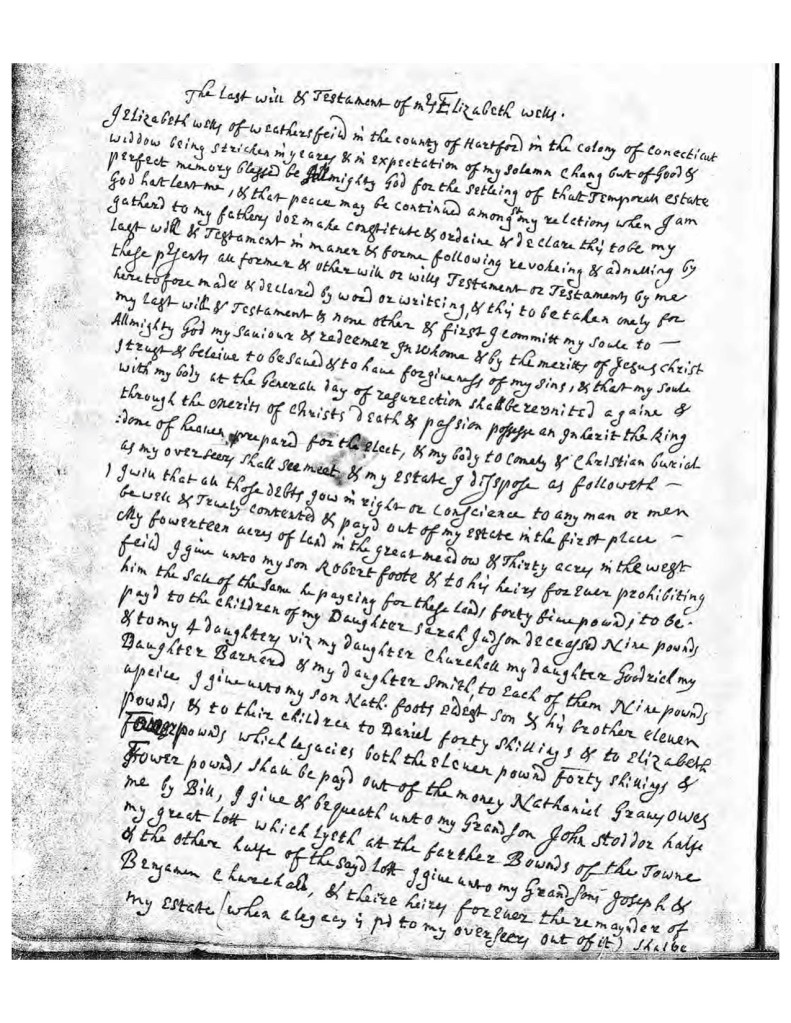 I, Elizabeth Wells, of Wethersfield in the county of Hartford, in the colony of Connecticut Widdo, Being stricken in years & in expectation of my Solemn Chang but of Good & perfect memory blessed be Almighty God for the setleing of that Temporall estate God hath lent me, & that peace may be continued amongst my relations when I am gathered to my fathers, doe make constitute & ordaine & declare this to be my last will &Testament in maner & forme following revokeing & adnulling by these presents all former & other will or wills Testament or Testaments by me heretofore made & declared by word or writeing, & this to be taken onely for my last will & Testament and none other