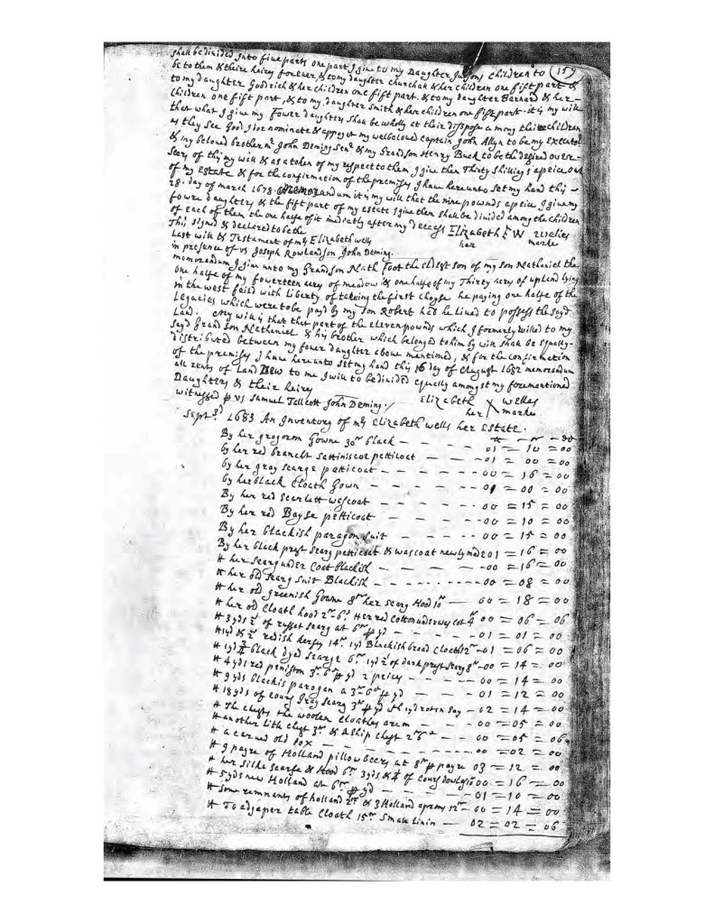 Her estate was inventoried in 1683. It can be viewed on the second page of her will, below. This twice-widowed octagenarian Puritan woman’s wardrobe included a “red scarlet waistcoat,” silk scarf, and other luxury items, some “recently made.” You have to respect that.