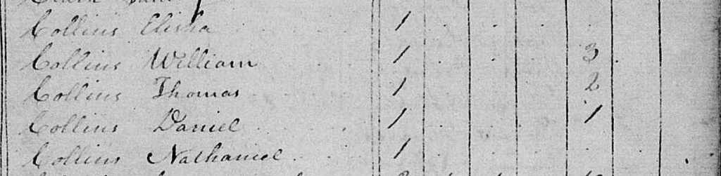 Hezekiah (or Ezekiah) Collings is another likely son of Thomas Collings, based on his presence in the same district as the four known sons on tax lists, as is a James Collings. And a George and Jeremiah Collings are also in the running, though I personally feel that the connection in those cases is not as firm.