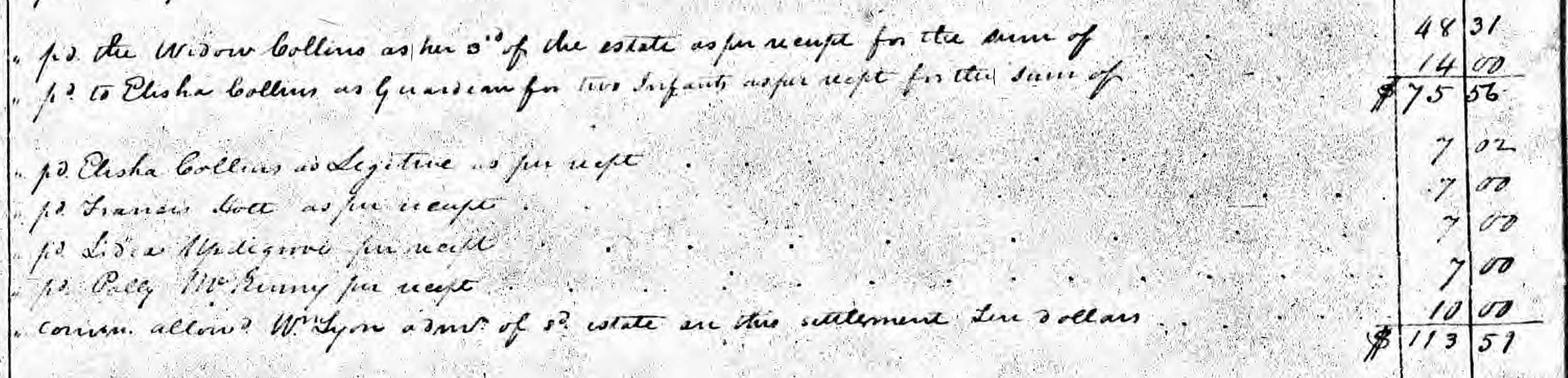 Below, Elisha Collings received $7, and appears to be as a “Legatee.” Frances Holt, who is also a known child of William Collings, receives $7. And finally Lydia Uptigrove and Polly McKinny each receive $7. This can only be a share of William Collings’ estate.