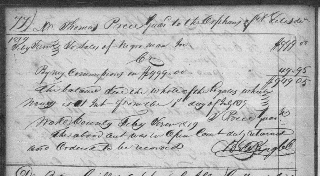 Joe’s last job was for Charles King, through January of 1819. In February of 1819, Thomas Price reported that Joe had been sold for $999, with Price taking $49.95 as a sales commission.