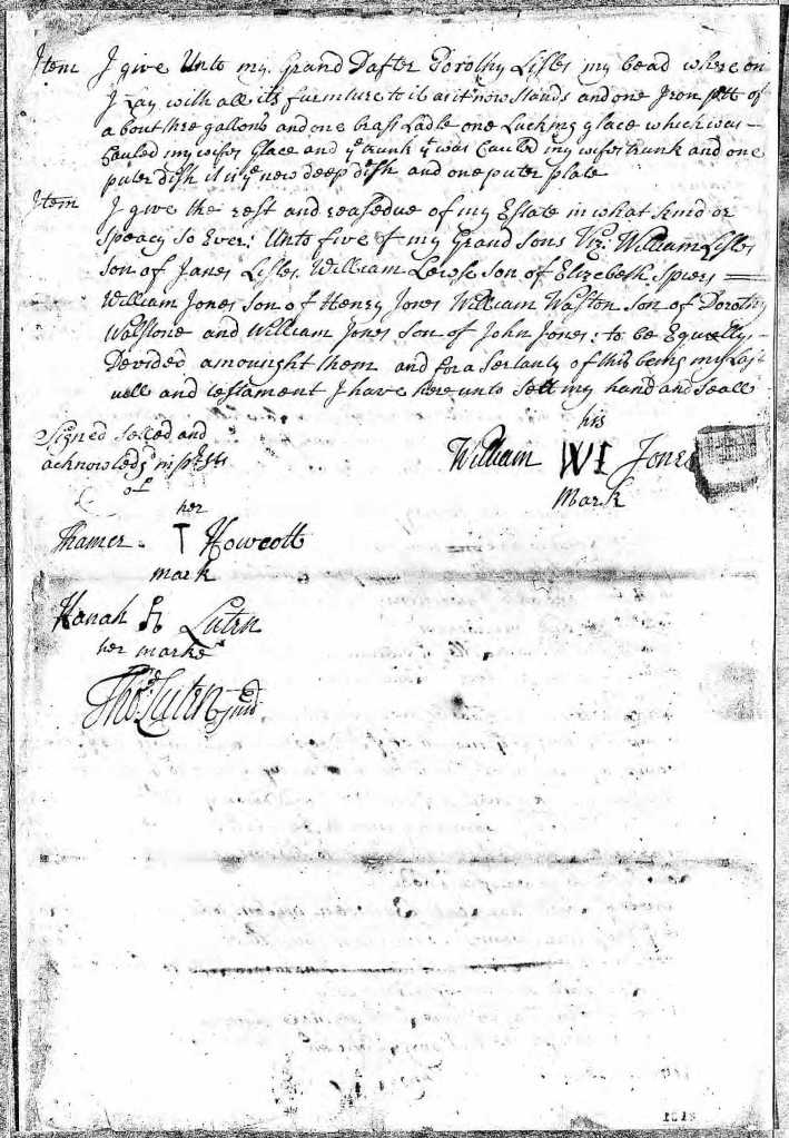 Item: I give the rest and residue of my Estate in what kind of ____so Ever unto my five Grand Sons Viz: William Lisles son of Jane Lisles, William Lowse son of Elizabeth Spiers. William Jones son of Henry Jones, William Walton son of Dorothy Walton and William Jones son of John Jones to be Equally Divided amoungst them and for a sertainty of this being my Last will and testament I have here unto sett my hand and seall.