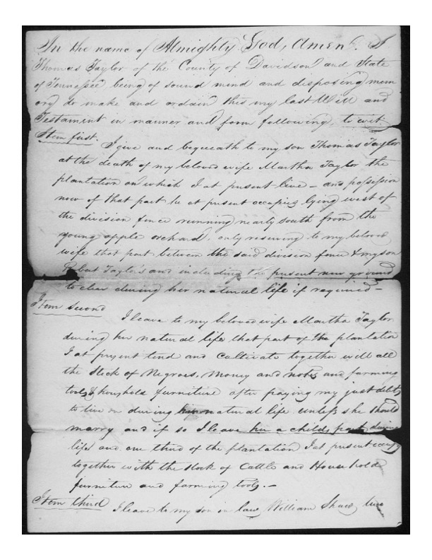 In the name of Almighty God, Amen. I Thomas Taylor of the County of Davidson and State of Tennessee, being of of sound mind and disposing memory do make and ordain this my last Will and Testament in manner and form following to wit: