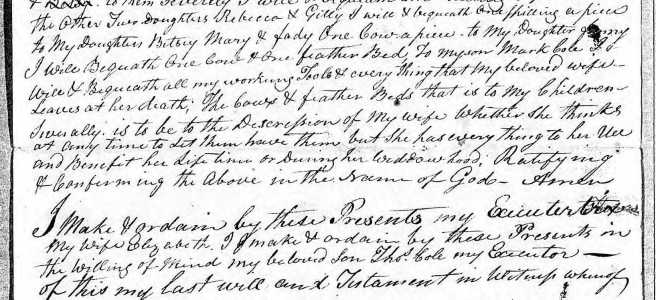 State of North Carolina, Wake County, August 6, 1803 In the name of God Amen, I John Cole Sen. Of Wake County and State of North Carolina being in sound and perfect mind and memory blessed be God do this sixth day of August in the year of our Lord one Thousand Eight Hundred and three. Make and publish … Continue reading Will of John Cole of Wake County, North Carolina, 6 August 1803